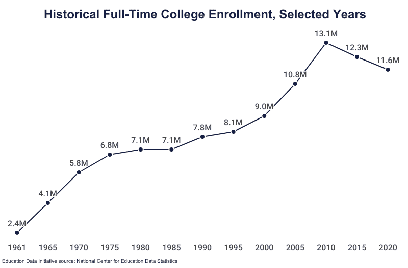 - The number of total enrolled post-secondary students declined by 4.9% from 2019 to 2021, the most significant rate of decline in enrollment since 1951.